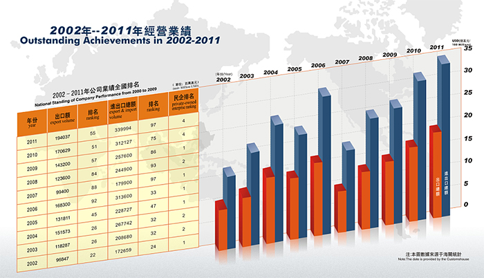 近年來,公司發(fā)展勢頭良好, 2014年公司實際出口額達到10.5億美金,排名“2014中國出口200強”第192名,其中民營企業(yè)排名第21名。公司先后獲得 “中國守合同重信用企業(yè)”、 “廣東省先進集體”、“廣東省優(yōu)秀民營企業(yè)”、“東莞市50強民營企業(yè)”,“東莞市文明單位”等稱號,公司被東莞市政府授予“東莞市50強民營服務業(yè)企業(yè)”光榮稱號,公司董事長陳海生被授予“東莞市優(yōu)秀民營企業(yè)家”光榮稱號。